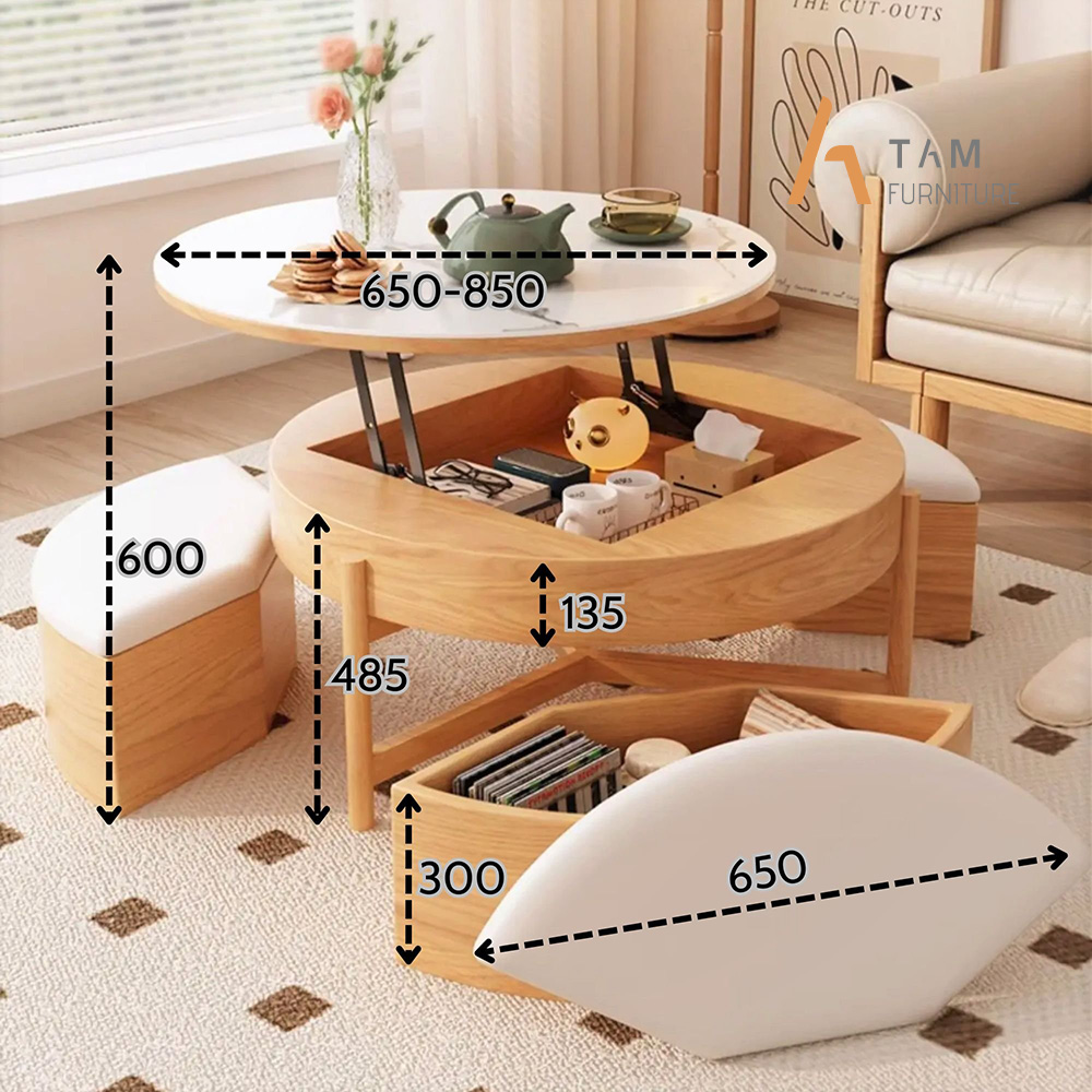 Cavo được thiết kế kết hợp hài hòa giữa bàn sofa kết hợp với 3 đôn gỗ có ngăn chứa bên dưới vừa vặn xếp gọn vào trong gầm bàn sofa.