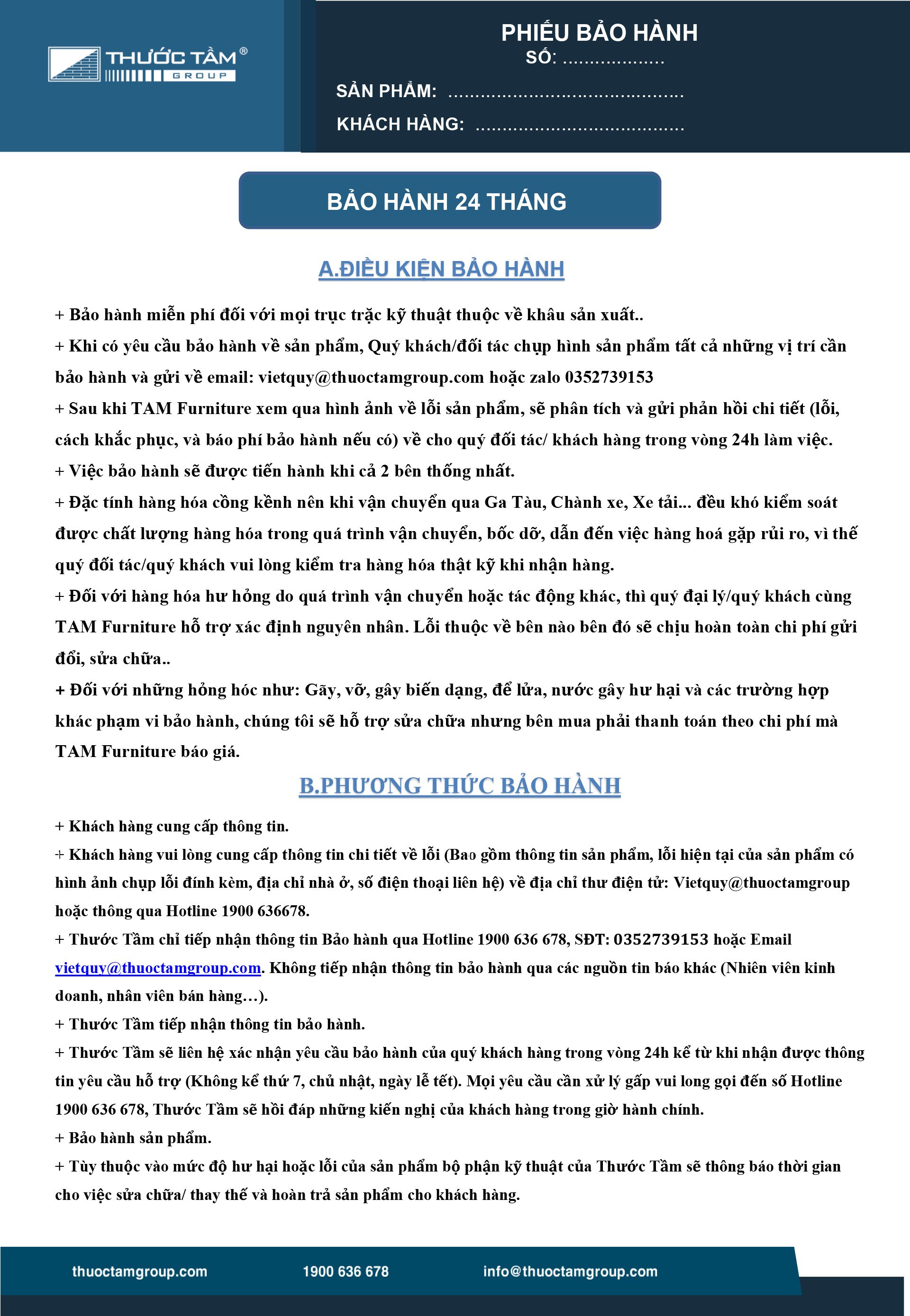 Toàn bộ sản phẩm nội thất của thương hiệu TAM Furniture được bảo hành 24 tháng.