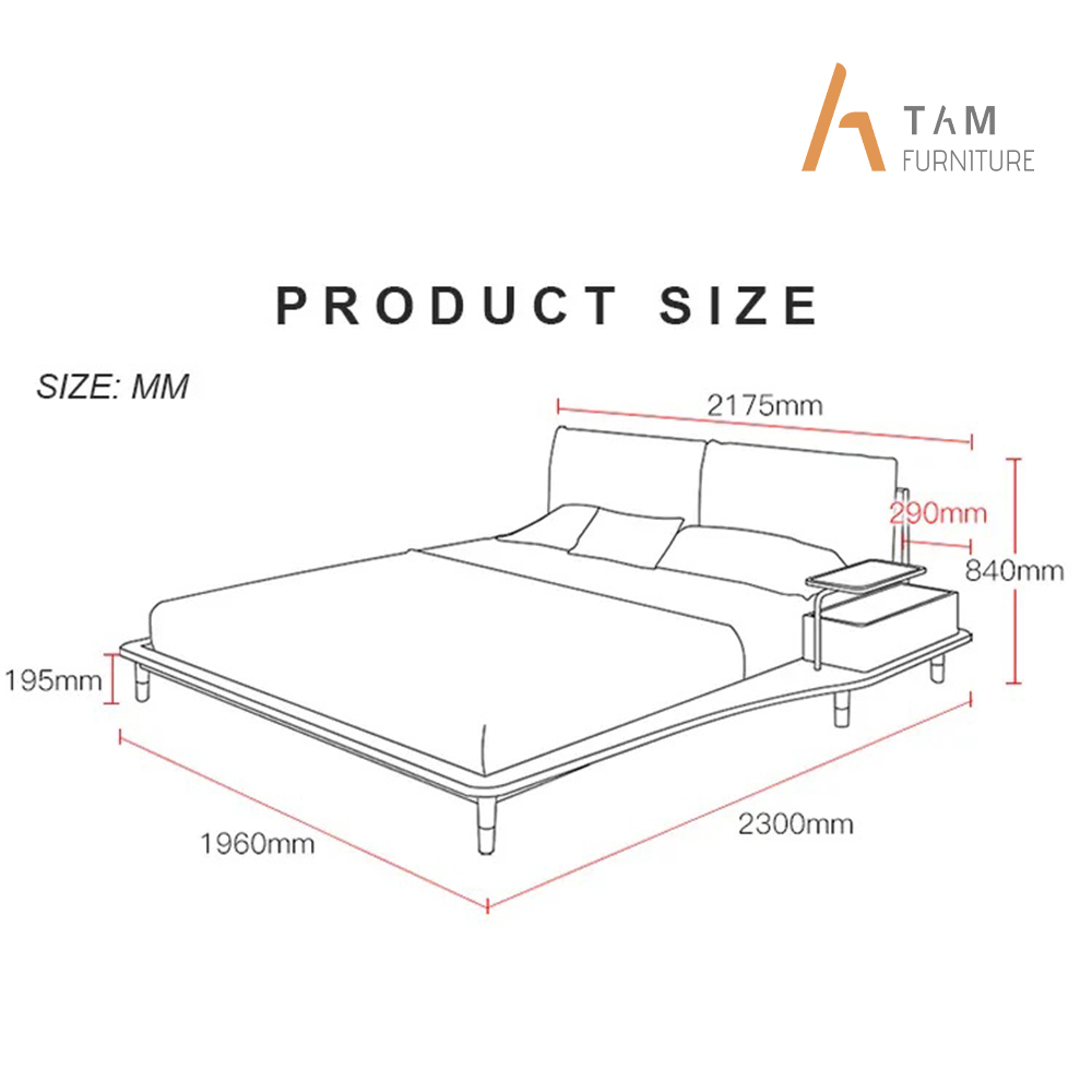 Thiết kế thông minh tiện lợi với ngăn hộp bên hông giường tiện lợi, các cọc chân trụ được bọc kim loại bố trí quanh chân giường. Tổng thể được phủ lớp sơn PU tạo bề mặt láng mịn, chống mối mọt tốt, làm nổi bật nên các nét vân gỗ tự nhiên chạy dọc quanh giường.