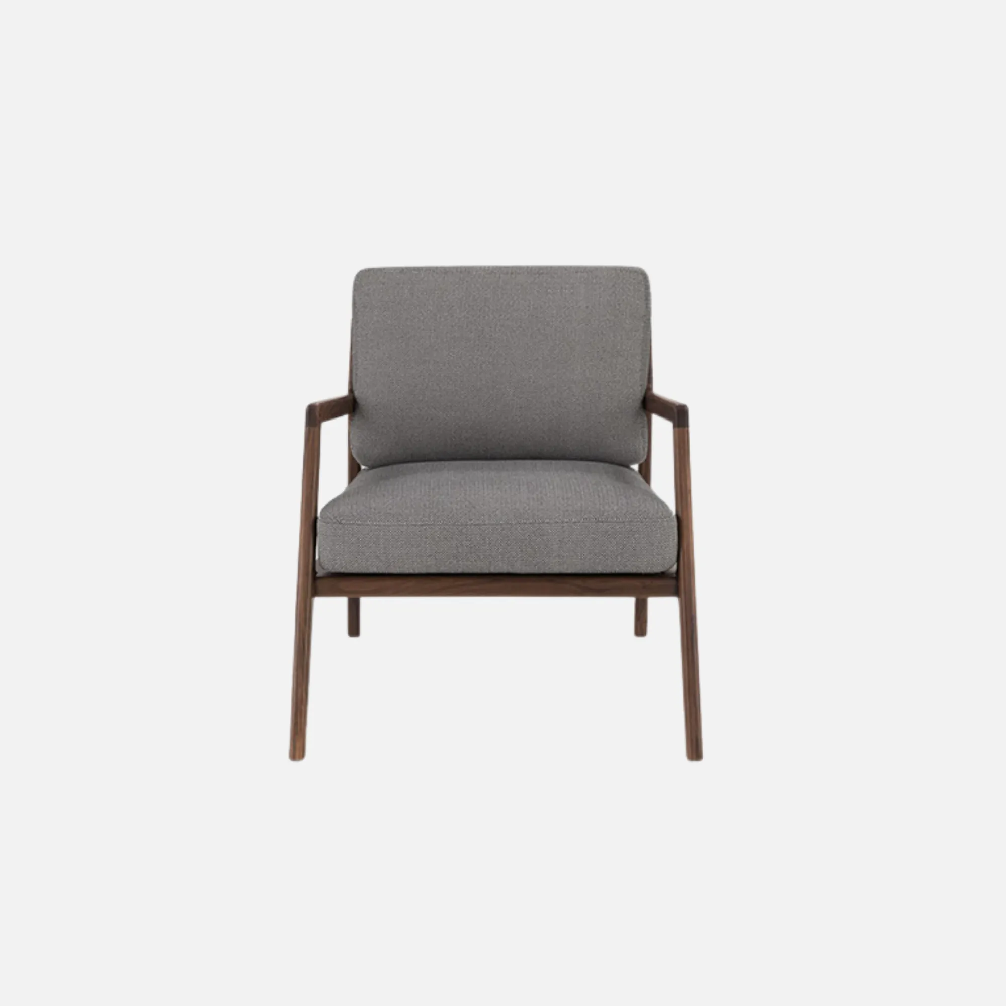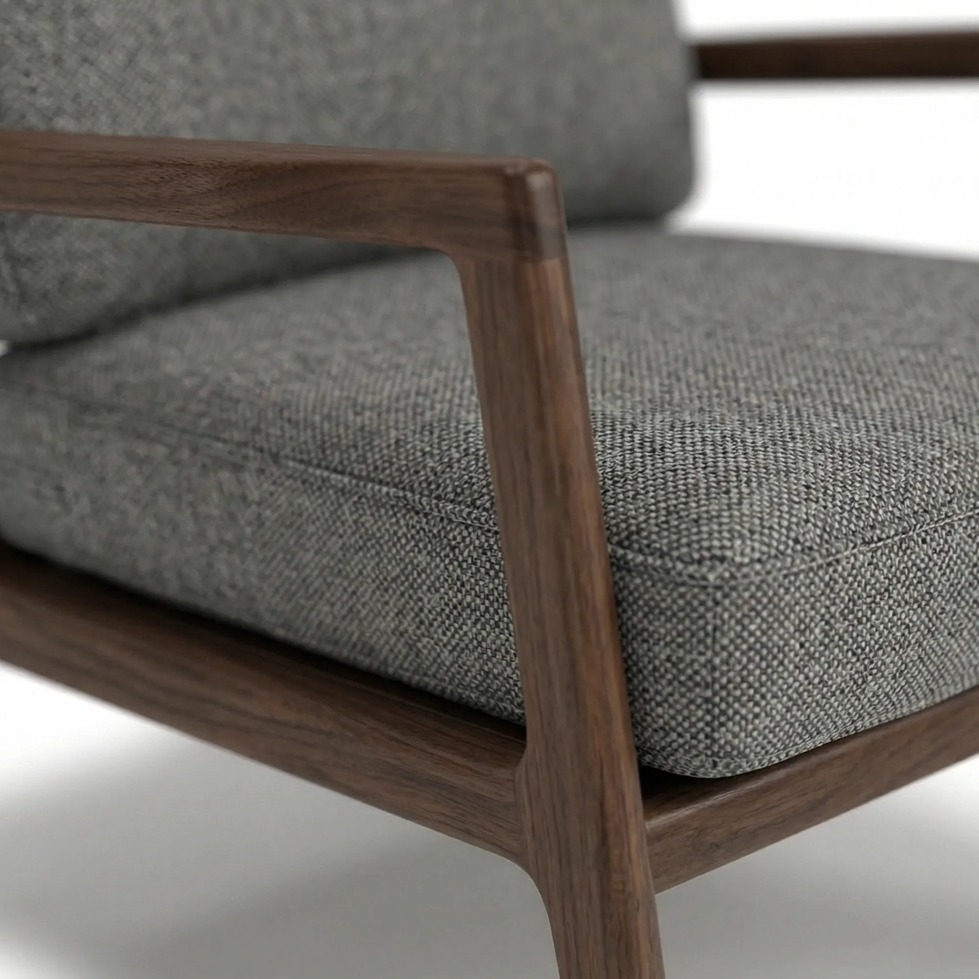 Sự tương phản đầy nghệ thuật được thể hiện qua phần đệm bọc vải dệt thô màu xám tiêu. Cấu trúc sợi vải đan xen tạo ra chiều sâu thị giác, mang lại cảm giác ấm áp và thân thuộc khi chạm vào. Chất liệu thoáng khí này giúp duy trì sự thoải mái ngay cả khi ngồi lâu, đồng thời có khả năng giấu đi những nếp nhăn nhỏ để duy trì form dáng chỉn chu.