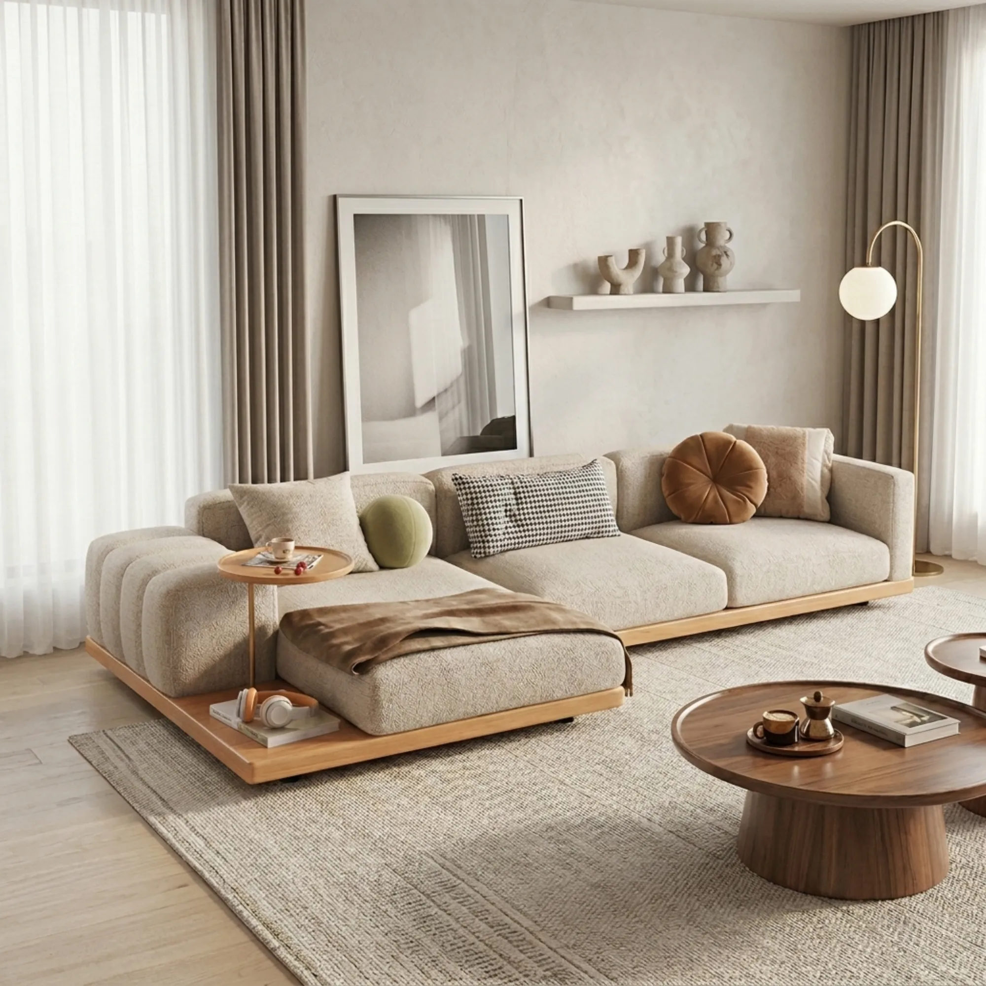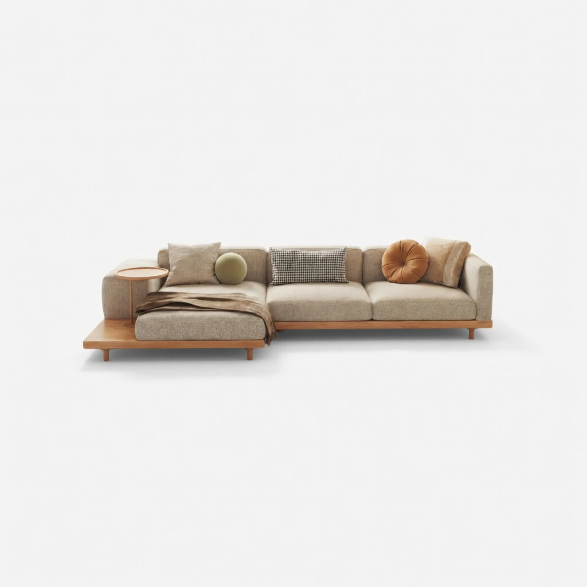 - Giá trị trải nghiệm: Sự kết hợp giữa hai module 2100mm và 3100mm tạo nên một hệ sofa góc chữ L có tỉ lệ cân đối, giúp phân định không gian một cách rành mạch mà không cần vách ngăn. Cách bài trí này thúc đẩy sự tương tác đa chiều: diện tích ngồi mở rộng đáp ứng nhu cầu đón tiếp khách quý, trong khi vẫn duy trì được góc tĩnh lặng cho nhu cầu cá nhân.