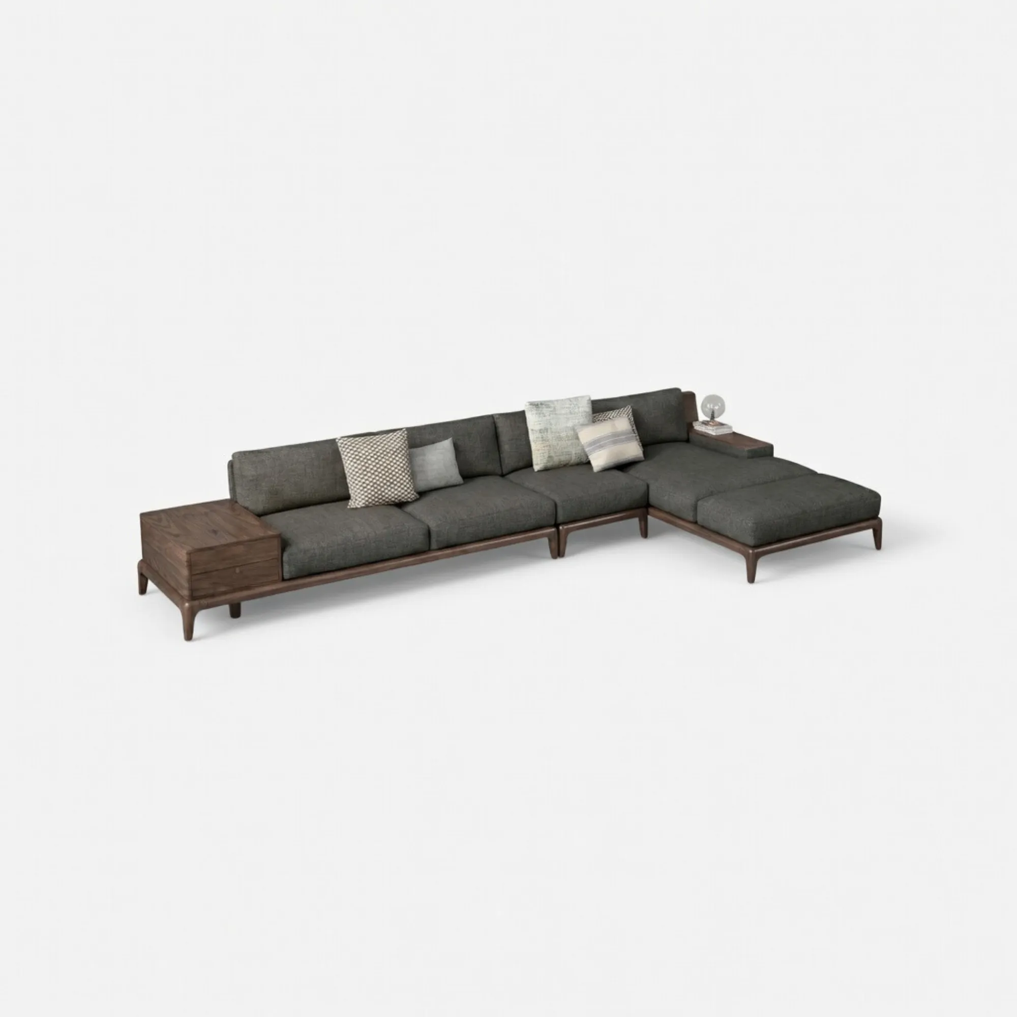 Điểm nhấn thông minh của phiên bản ghế sofa góc chính là việc tích hợp mặt bàn phụ bằng gỗ nguyên khối và ngăn kéo chứa đồ ở hai đầu. Thiết kế này giúp người dùng dễ dàng đặt một ly vang, cuốn tạp chí hay chiếc đèn đọc sách mà không cần bố trí thêm đôn kệ rườm rà, giữ cho không gian luôn gọn gàng và thoáng đãng.