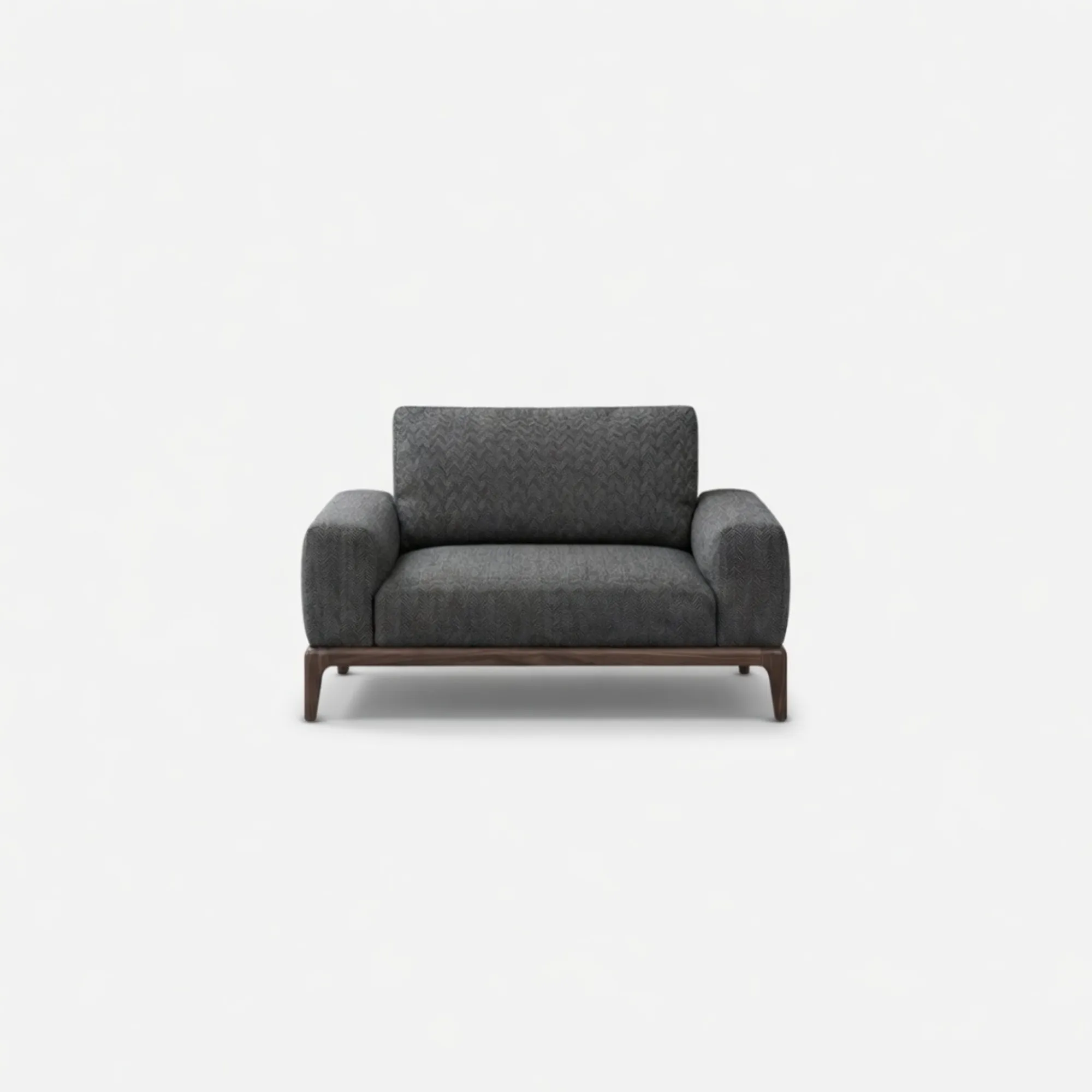 Phần đệm ngồi và tựa lưng được thiết kế vuông vức nhưng khéo léo bo tròn ở các góc, mang đến sự nâng đỡ trọn vẹn và thư giãn tối đa. Chất liệu vải dệt họa tiết vân chìm mang lại hiệu ứng thị giác sang trọng, có độ nhám nhẹ tự nhiên, đồng thời giúp bề mặt luôn sạch sẽ, dễ dàng chăm sóc trong quá trình sử dụng hàng ngày.