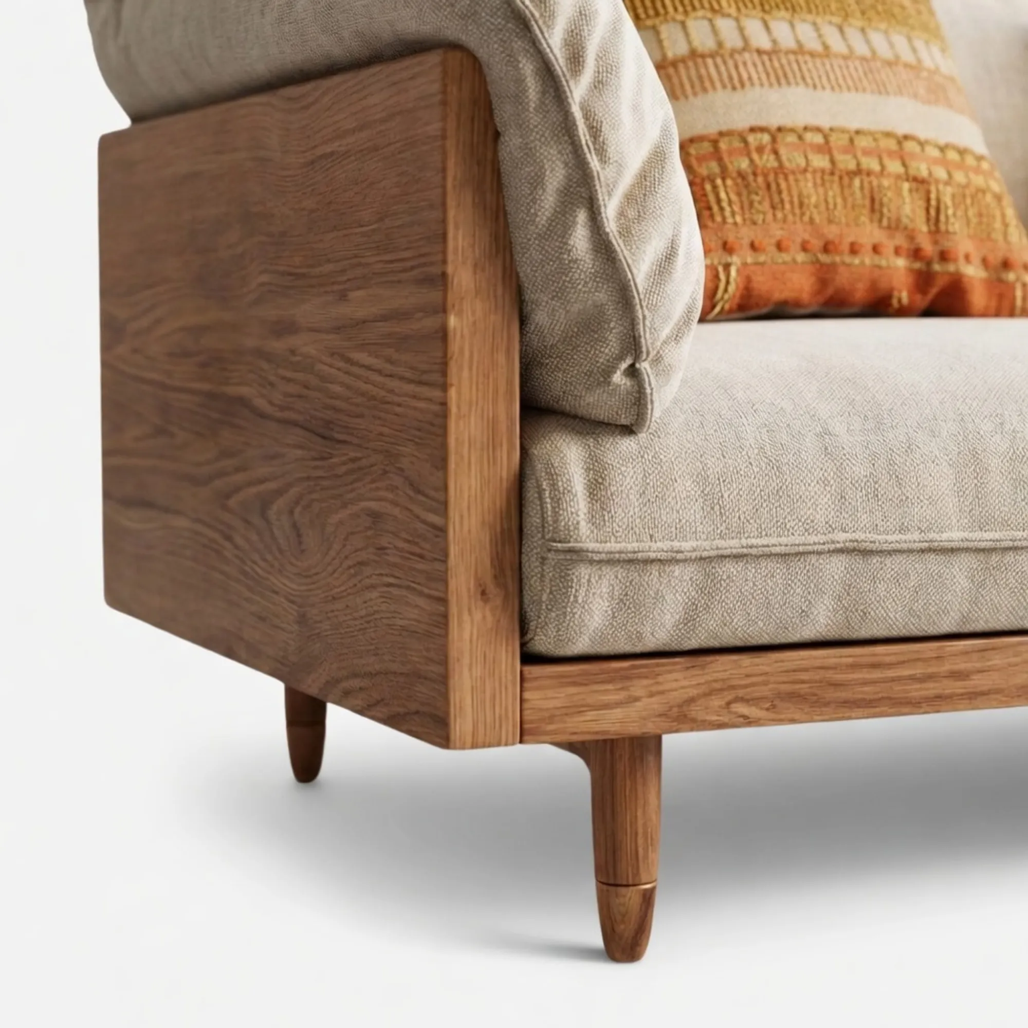 • Sự cân bằng giữa cứng và mềm: Khung gỗ Tần bì được tạo hình vuông vức, vững chãi, đối lập hoàn hảo với hệ nệm vải hoặc da bọc tràn viền mềm mại. Thiết kế này giúp bộ ghế sofa trông mạnh mẽ nhưng khi ngồi lại cực kỳ êm ái và phóng khoáng.