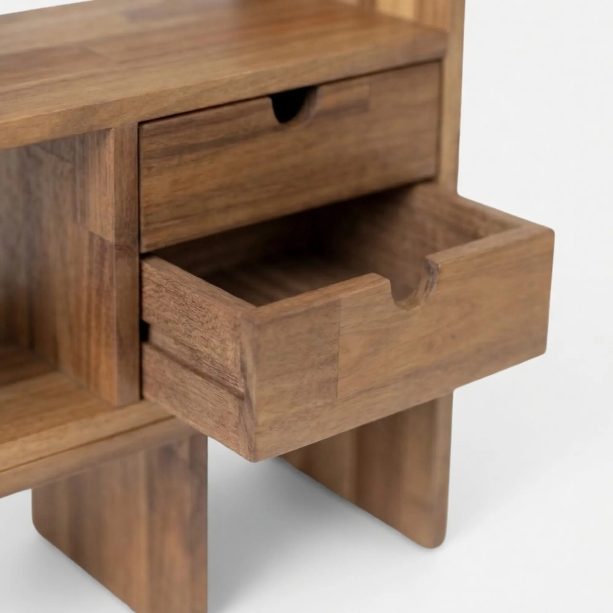 Góc làm việc gọn gàng không chỉ giúp tăng cường sự tập trung mà còn là bến đỗ khơi nguồn cho những ý tưởng đột phá. Thấu hiểu điều đó, TAM Furniture giới thiệu kệ để bàn gỗ tràm Miranda như một giải pháp lưu trữ tinh tế, vỗ về cảm xúc của những người bận rộn. Với kích thước nhỏ gọn chiều cao 450mm và bề sâu chỉ 160mm, cùng thiết kế phân tầng thông minh, chiếc kệ để bàn gỗ này giúp bạn sắp xếp sách vở, sổ tay hay một chậu cây mini vô cùng ngăn nắp mà không chiếm dụng diện tích mặt bàn. Sự kết hợp giữa chất liệu mộc mạc và hơi thở New Mid-Century không chỉ tạo nên một chiếc kệ gỗ để trên bàn tiện dụng, mà còn khắc họa rõ nét gu thẩm mỹ thanh lịch, yêu lối sống tối giản của gia chủ.
