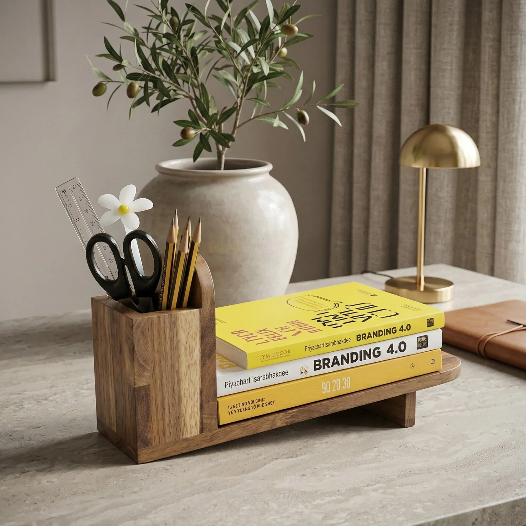 Gợi ý bài trí từ Kiến trúc sư: Kệ để bàn gỗ tràm Xenia đạt hiệu ứng thẩm mỹ cao nhất khi phối cùng phụ kiện đồng, da hoặc sắc xanh lá. Hãy ưu tiên đặt kệ trên mặt bàn màu trắng kem hoặc trung tính để tôn vinh trọn vẹn sắc nâu ấm và đường vân tự nhiên của gỗ Tràm.