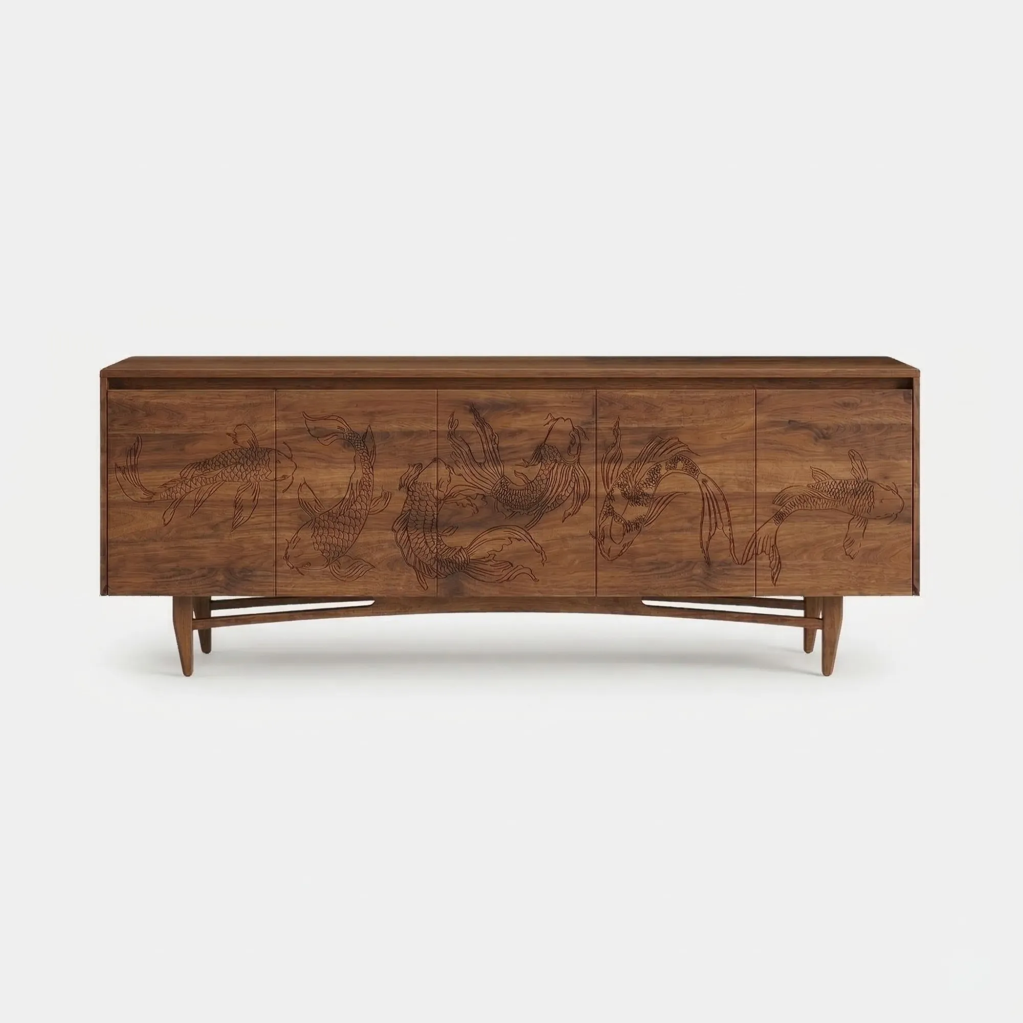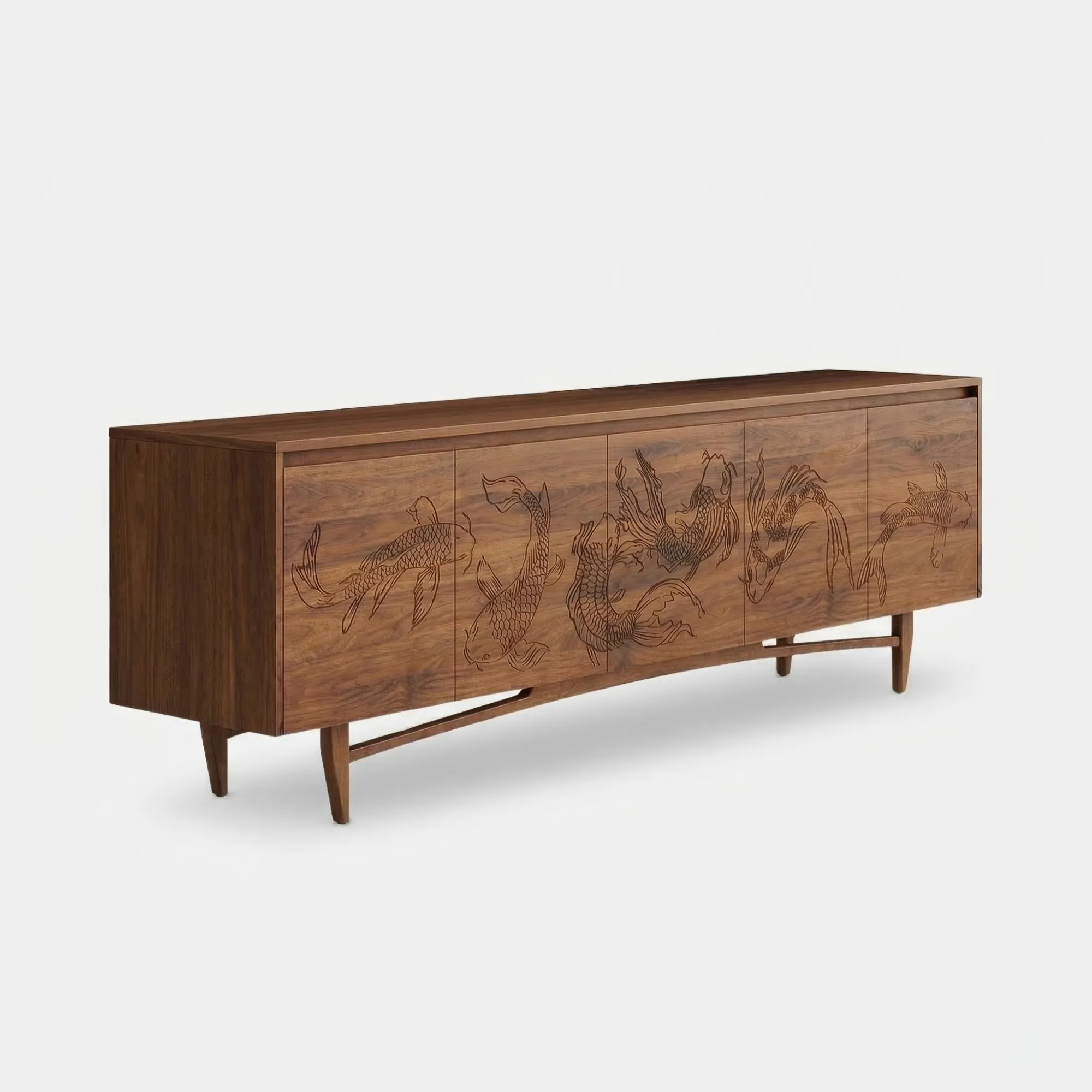 - Kỹ nghệ chạm khắc đàn cá Koi liền mạch: Tác phẩm mỹ thuật độc bản với hình ảnh đàn cá khắc chìm tinh xảo, chạy xuyên suốt 4 cánh tủ mà không bị ngắt quãng tại các khớp nối. Đường nét mảnh mai đòi hỏi tay nghề mài giũa tỉ mỉ, biến chiếc tủ tivi gỗ tự nhiên này thành một bức tranh nghệ thuật sống động.